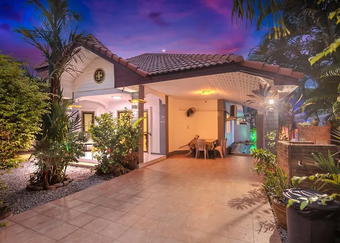 The 3-bedroom Villa Corner Near Walking Street And Beaches Pattaya is located 4.2 km from Nong Nooch Tropical Botanical Garden and provides a swimming pool, ensuring a relaxing stay. The villa is featuring a shared lounge with a swimming pool.